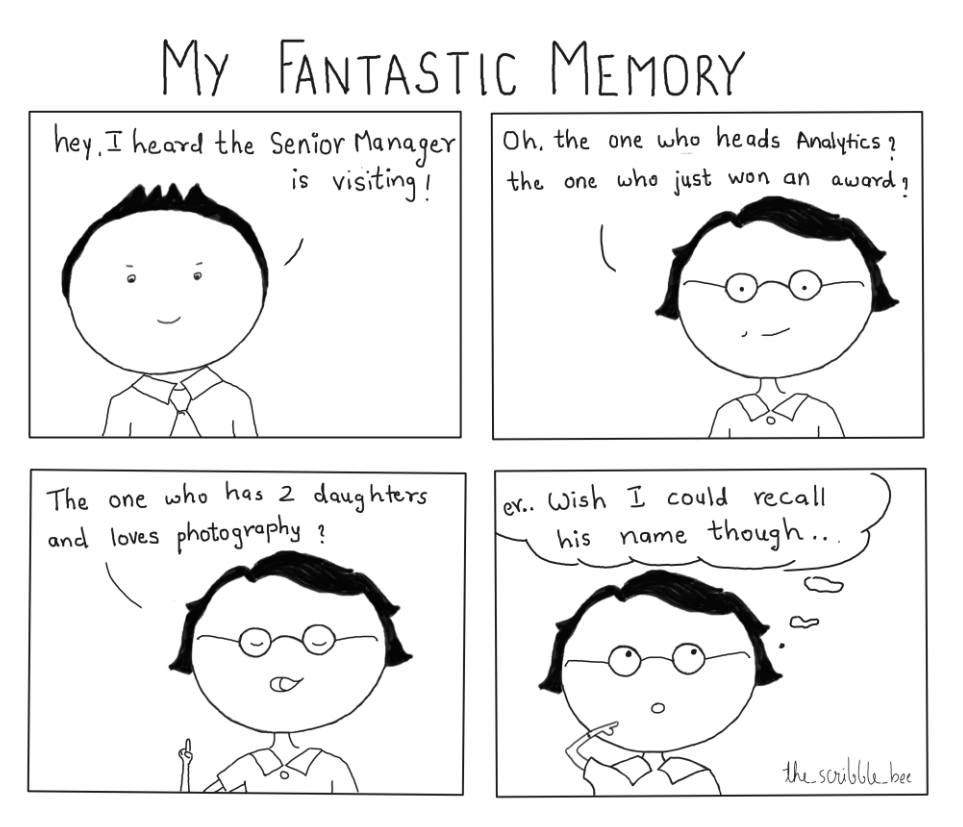 I will remember the plant the intern in my team has at her desk. I will remember what “quote of the day” she had on her white board last monday. I will remember the full form of the shitty acronyms that the manager makes up in every quarterly meet. I actually read those “Meet your colleagues” mailers that HR sends every month. I remember random people’s life story – Where they went to school, what breed of dog they have, what crazy hobbies they have.