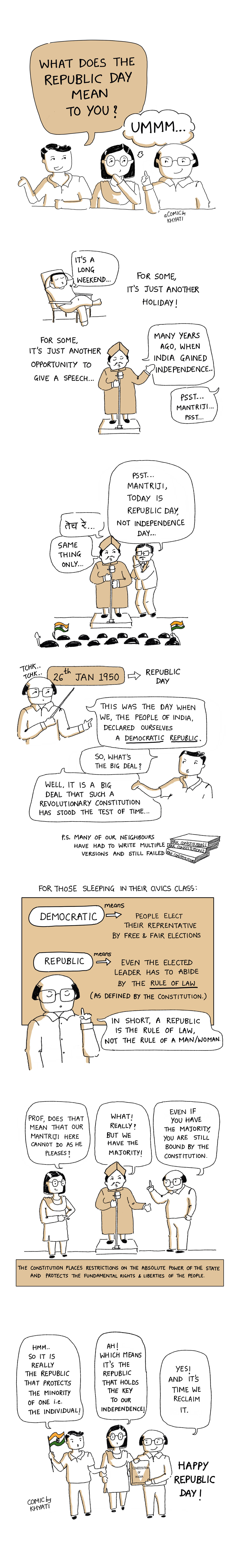 The concept of the Republic is a topic that has fascinated me for a while now. The idea that even the sovereign is not above law is a powerful idea. One can say that Constitutionalism is indeed a human innovation just like currency is. It is a collective trust that humans put into a piece of paper or a document! We often make a big deal about our independence, but independence for an individual will have no meaning without the concept of the Republic. This comic is a quick one—we have explored the topic in much depth in the book. The book also delves into how the State, Market and Society comes together in affecting the outcomes of our life. Something that we all need to be more aware of..